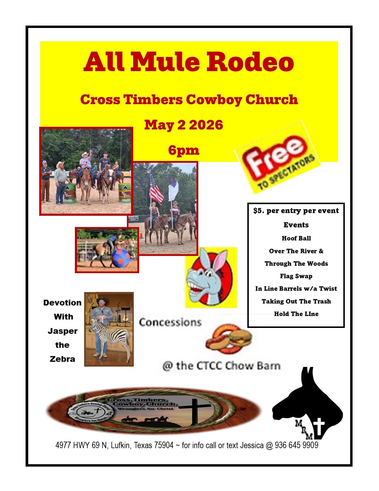 Cross Timbers Cowboy Church Arena ALL MULE RODEO! Saturday May 2,2026 starting at 6 P.M., $5.00 entry fee per event, free admission, the Chow Barn will be open. Events Hoof Ball, Speed Ball, River Race, Disco Bucket, Musical Rings, Race, Wild Mule Saddling. Devotion with Jasper the Zebra. For information call or text Billy Jessica Palacio at (936) 645-9909.