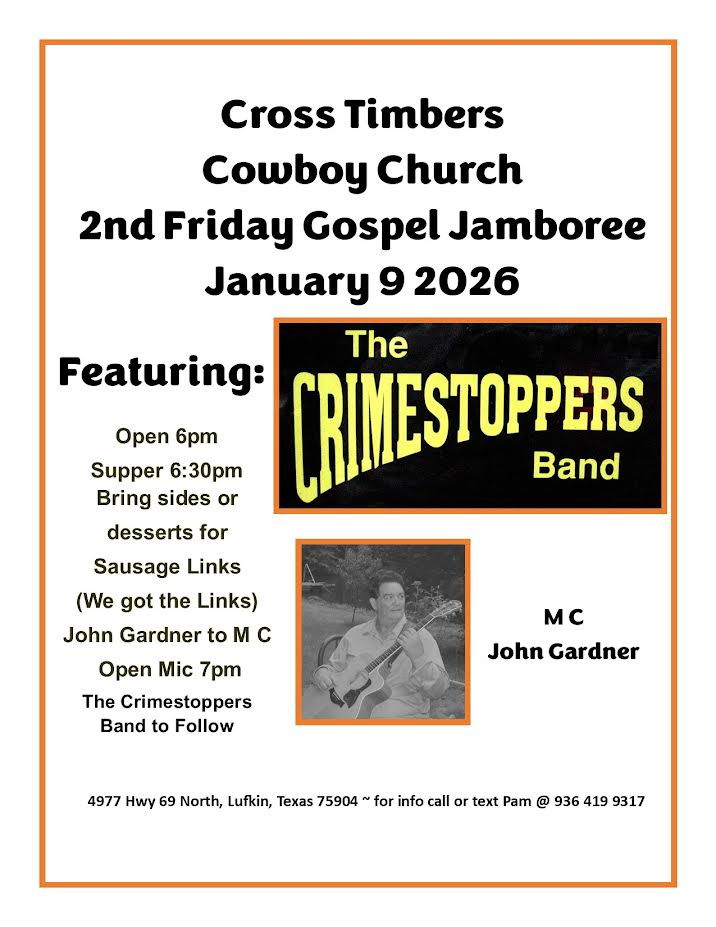 Cross Timbers Gospel Jamboree Friday January 10, 2025 Featuring “The Crime Stoppers Band” Doors open at 6p.m. Supper at 6:30, “The Crime stoppers Band” will perform after open mic John Gardner will host m.c. and sing before the concert.